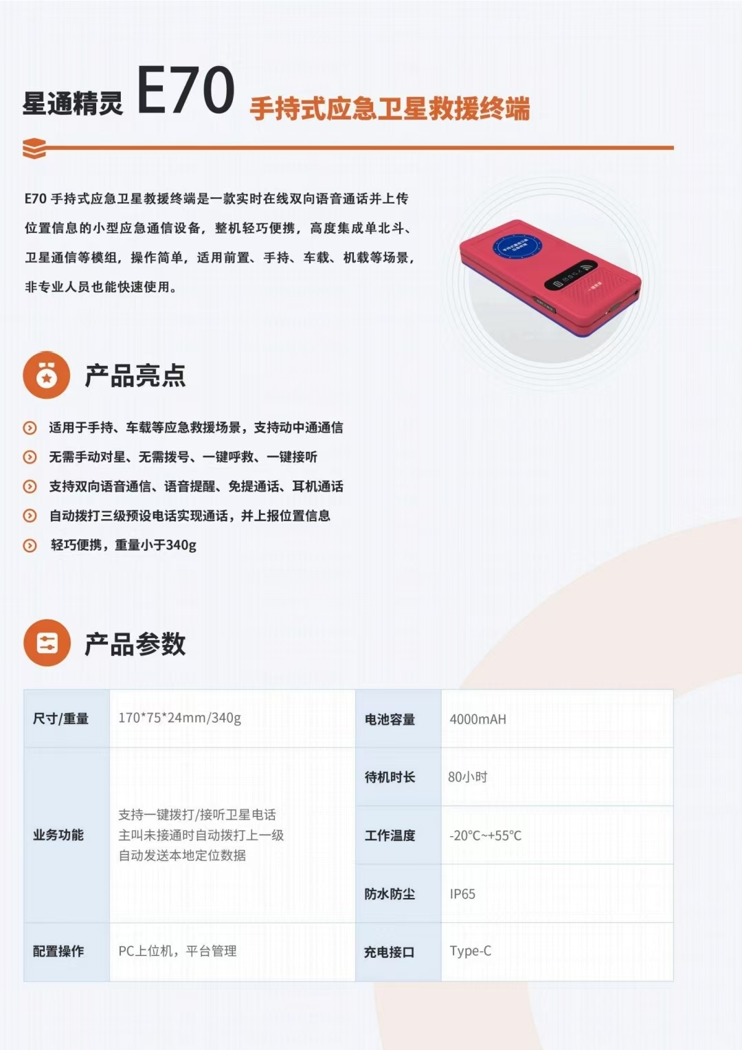 E70手持式應(yīng)急衛(wèi)星教援終端是一款實(shí)時(shí)在線雙向語音通話并上傳位置信息的小型應(yīng)急通信設(shè)備,整機(jī)輕巧便攜,高度集成單北斗、衛(wèi)星通信等模組,操作簡單,適用前置、手持、車載、機(jī)載等場景非專業(yè)人員也能快速使用。